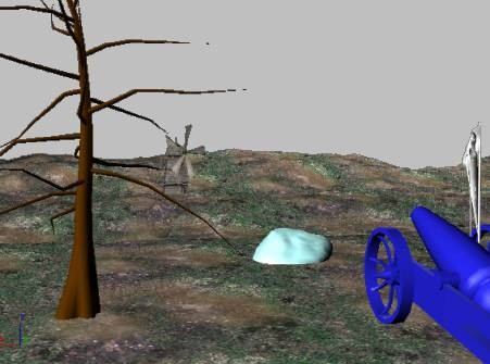 شما با اضافه کردن متریال به اشیاء صحنه، آنها را واقعی تر میکنید. شالودهی متریال می تواند شامل عکس های گرافیکی و یا طرح های برجسته باشد. در این آموزش، میدان جنگ، توپ جنگی، صخره، درخت و همچنین آسیاب همه ظاهر خود را از عکس های گرافیکی دریافت می کنند.