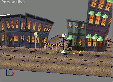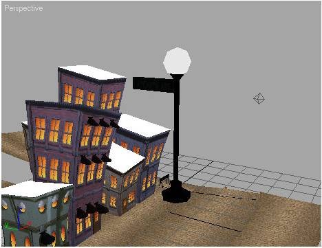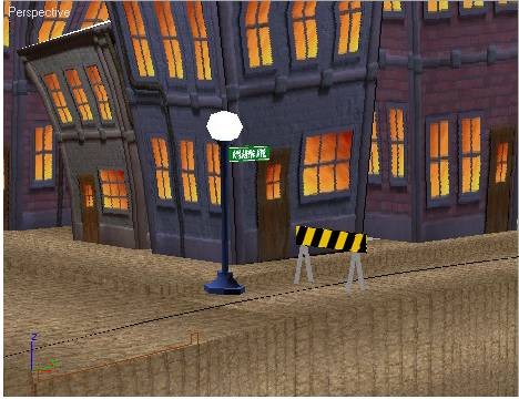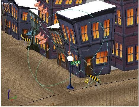 11. در نمای Perspective، بر گوشهی خیابان، جایی که چراغ را قرار دادید زوم کنید.