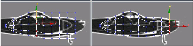 9. همان طور که به نمای Left و نمای Top نگاهی دارید، نقاط اتصال انتخاب شده را به طرف جلو بکشید تا نوک اتاقک شکل گیرد. Soft selection را غیر فعال کنید و نقطهی اتصالی که در مرکز قرار دارد را حرکت دهید تا به نوک اتاقک شکل بهتری بدهید.