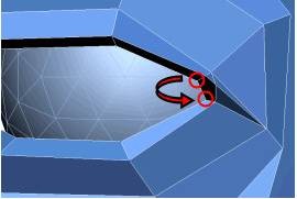 7. به حالت Vertex بروید. سپس برای آنکه پلک پایینی به خوبی در زیر پلک بالایی قرار گیرد، با استفاده از ابزار Target Weld، دو نقطهی اتصالی که در زیر نشان داده شده است را در یکدیگر ترکیب کنید. با این کار یک پنج ضلعی از بین می رود.