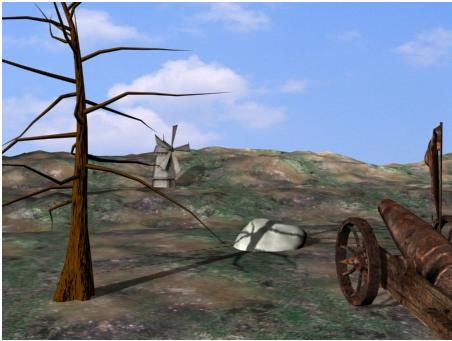 با استفاده از ویژگی های خاص برنامه، می توانید میدان جنگی را ترسیم کنید که از یک توپ جنگی، یک صخره، یک درخت و یک آسیاب بادی تشکیل شده است. همچنین میتوانید دوربینی به آن اضافه کرده و از آن برای دیدن صحنه از زوایای مختلف استفاده کنید.
