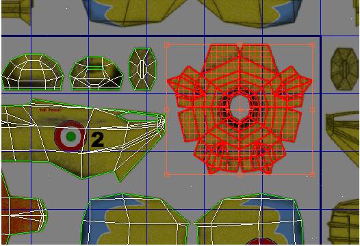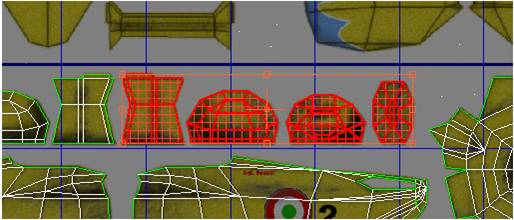 حالا میتوانید در پس زمینه و در مقابل texture map ، دسته های UVW را مشاهده کنید که در معرض نمایش قرار داده شده اند. هر کدام از دسته ها قسمتی از شیئ Fuselage را نمایش میدهند که با قسمت های زیرین bitmap texture به صورت سطحی طرح دهی شده اند (یا همان planar-mapping)