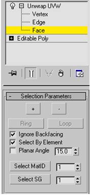 3. در modifier stack بر روی گزینهی Face کلیک کنید . همچنین در قسمت Parameters مطمئن شوید که گزینهی Select By Element تیک خورده ست.